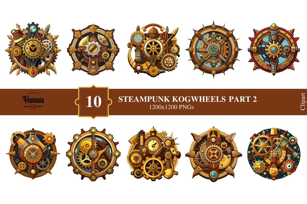 Elevate your design work with our exclusive Steampunk Cogwheels Clipart Set Part 2! ๐ ๏ธ๐จ This premium bundle features 10 intricately crafted cogwheel images that capture the essence of steampunk fantasy. Each 1200x1200 PNG image boasts stunning clarity and detail, ideal for both print and digital creations.
